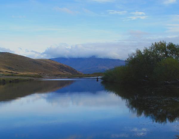 Low clouds over rìo Chubut and a lonely flyfisher.