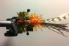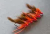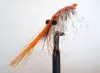 This muddler is tied on a small stainless Mustad hook using orange deer hair, orange dyed grizzly hackle and natural rabbit dubbing with a bit of orange flash mixed in. A small beauty indeed and sooo easy to see at night. |