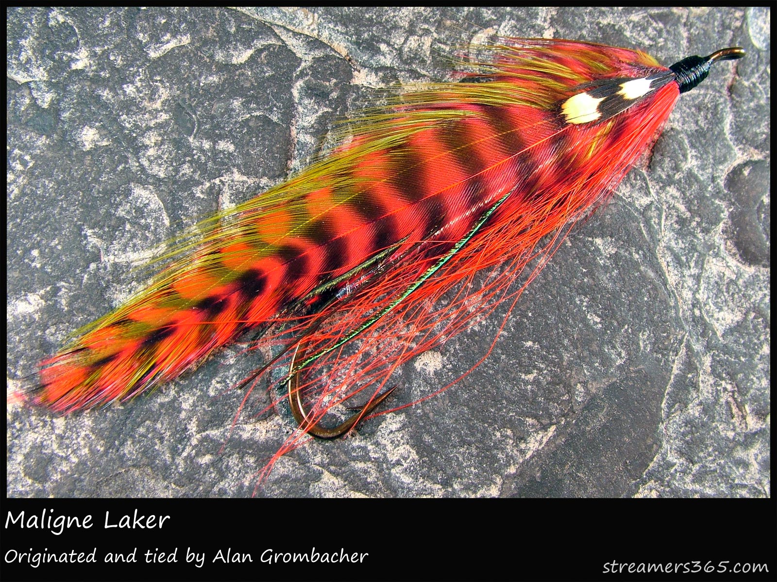 The Maligne laker has been one of my most successful patterns. Brookies simply love to slam this fly. Rainbows of the mountain lakes also like it. It is one of two similar patterns that use a similar color combination. This pattern fishes well throughout Westerns Canada. ~ Al Grombacher