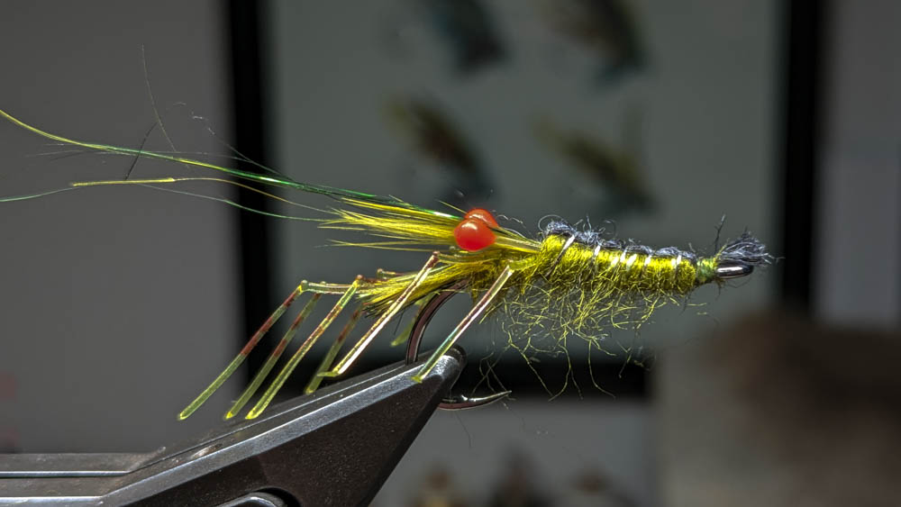 My darling wife had a lot of leftover green yarn from a knitting project, and I now have scraps for hundreds of bright, green flies. Combined with green legs and bright orange eyes from Easy Shrimp Eyes and tied on an Ahrex Hooks shrimp hook I created this Mean Green Mother from Outer Space.